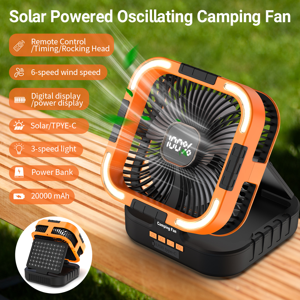 Warm (3000K)/cool (6000K) lighting with dimming; 10,000/20,000mAh battery + 4W solar charging for 23H+ low-speed runtime.